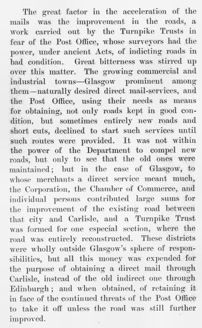 Glasgow “contributed large sums for the improvement of the existing road” which would be known in various times as the London Road/ A74/ M74. Unless the road was kept in a satisfactory condition there was always the fear that the Post Office would establish an indirect mail via Edinburgh.