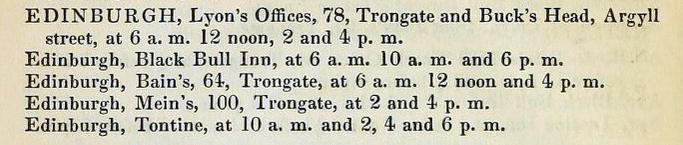 By 1838, a decade before the widespread arrival of the railway, there were lots of rival coach proprietors operating from the Trongate in Glasgow. The Glasgow - Edinburgh route was served by James Walker's coach from the Tontine Hotel, Joseph Bain's coach from 64 Trongate, Lyon's coach from 78 Trongate and William Mein's coach from 100 Trongate. The coach from the Black Bull Inn departed from the other side of the road, at the corner of Stockwell Street and Argyle Street.