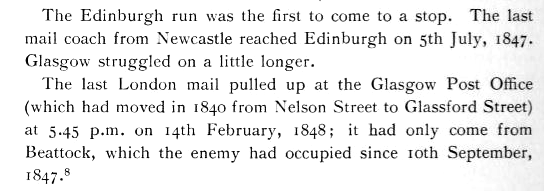 The last coach carrying the London mail arrived in Glasgow on 14th February 1848. The extension of the Caledonian Railway from Beattock to Glasgow came into operation the following day.
