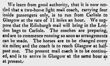 A new “fast” mail coach from Carlisle to Glasgow was introduced in 1832, carrying just 4 passengers. It travelled at 11mph and required a change of horses every 6 miles!