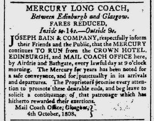 According to the Post Office Directory, Mr. Joseph Bain was the proprietor of the Mail Coach Office at 64 Trongate at the time of this notice.