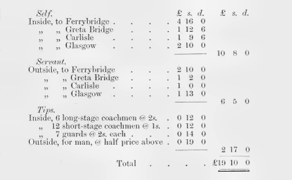 In 1812 the cost of a journey from London to Glasgow was £10.8s, exclusive of tips to coachmen and guards and the cost of food, drink and overnight accommodation. The fare for the manservant travelling on the outside was £6.5s. The total cost was £19.10s, excluding the expense of 3 overnight stops at roadside inns.