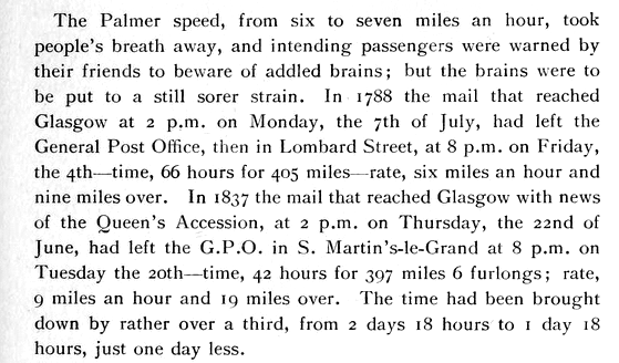 Here is a comparison of the speeds in 1788 and in 1837 when Queen Victoria came to the throne. In the space of a whole human lifetime the average speed had gone up all the way from 6mph to 9mph!