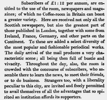 This description of the use of the Tontine Coffee Room from 1820, shows how news was eagerly anticipated with the daily arrival of the mail coach. Information was a valuable commodity at the time.